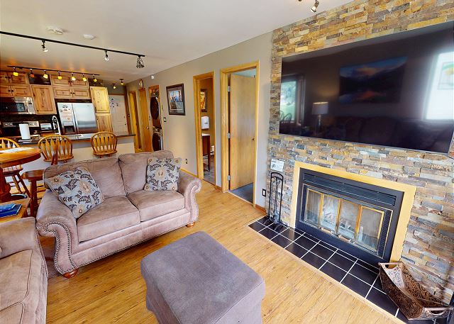 Pet friendly Cinnamon Ridge II #1 is a ground floor, end unit that is beautifully updated. This 2 bedroom, 2 bath condo sleeps 6 and is just a 6 minute walk on the boardwalks across the wetlands to the Mountain House base area lifts and about 8 minutes to the ski/ride school. You can also shuttle or drive to the resort. Views of Keystone Mountain, river and wetlands. Living room has comfortable seating, large flatscreen, wood fireplace and sofabed. Free WiFI and cable. Fully-equipped kitchen has granite-tile countertops and stainless appliances. Full size, washer and dryer in unit for convenience. Dining table seats 4. Kitchen bar seats 2. High chair in unit. Large covered deck with electric grill overlooks the valley and slopes and has a table for 2. Recreation/bike path right out the door. South facing and full of light. Cinnamon Ridge boasts a great combination of location to the slopes, with comfortable accommodations at an affordable price. Close to the Black Mountain Lodge and Ski Tip Lodge wedding venues. Please Note: Only 2 pets allowed. A $300 Pet Deposit is taken on Arrival and is refunded if no damage is found after check-out inspection.