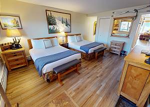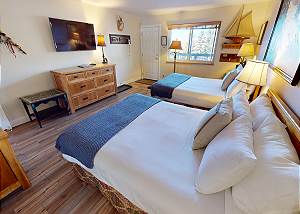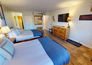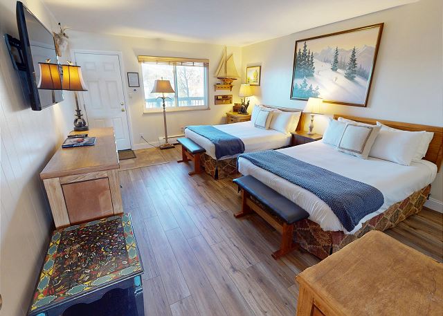 Primary Bedroom with 2 New Queens, Flatscreen, Bath -