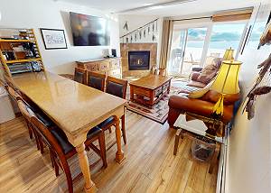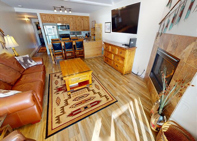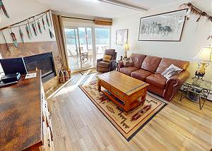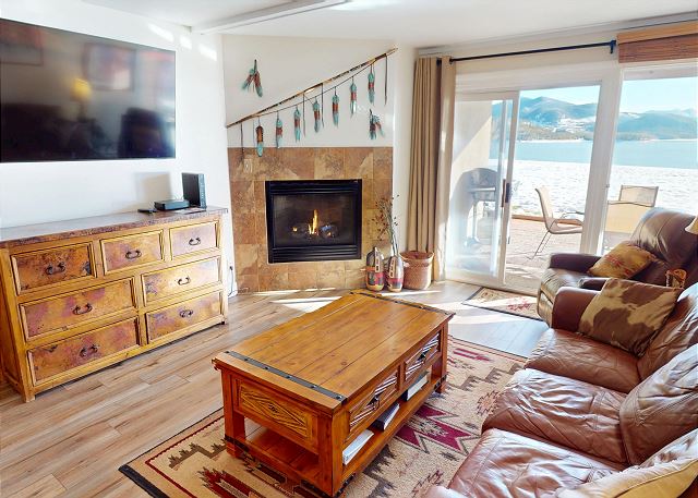 Living Area with Large Flatscreen, Gas Fireplace, Patio Entry -