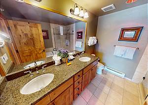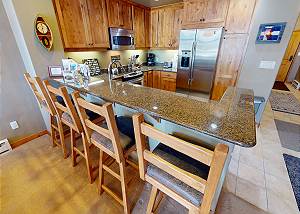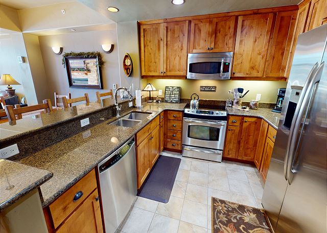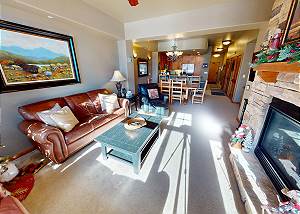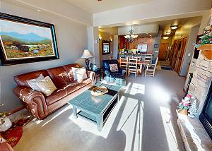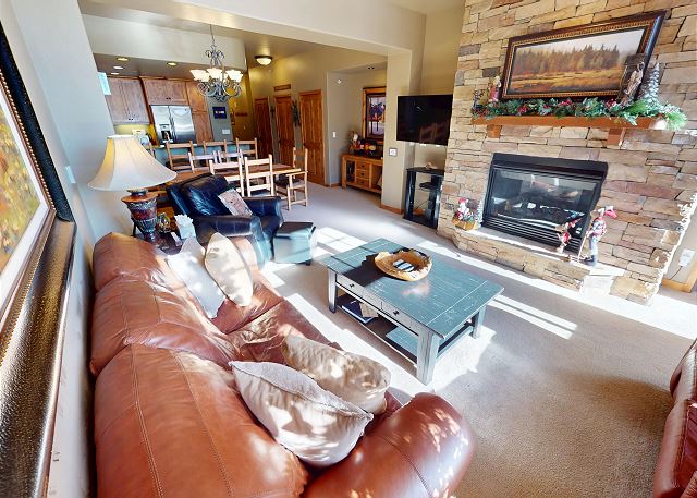 Two bedrooms are suites with private baths. Beautiful interior design with oil paintings and Colorado style. A great place to relax and enjoy family and friends. The fully equipped slab granite kitchen with stainless appliances allows for easy meals. Comfortable leather furniture, flatscreen and gas fireplace in living area. Free WiFi and cable. The dining area seats 6 and the kitchen bar seats 4. South-facing deck with mountain views and table for 2. Full size washer and dryer in the unit.